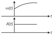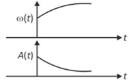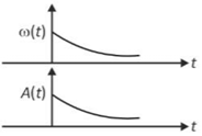 24. In an oscillating spring mass system, a spring is connected to a box filled with sand. As the box oscillates, sand leaks slowly out of the box vertically so that the average frequency \(\omega\left(\text{t}\right)\) and average amplitude \(\text{A}\left(\text{t}\right)\) of the system change with time t. Which one of the following options schematically depicts these changes correctly?
