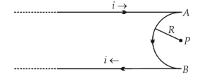3. A very long conducting wire is bent in a semi-circular shape from A to B as shown in figure. The magnetic field at point P for steady current configuration is given by