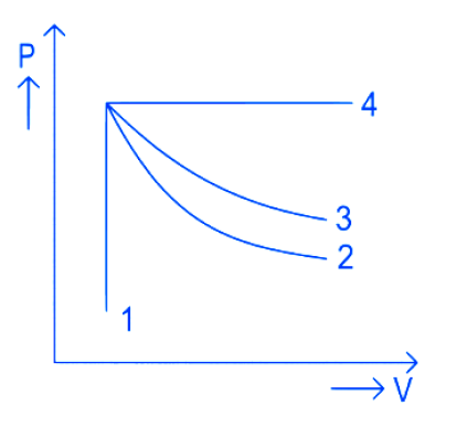44. An ideal gas undergoes four different processes from the same initial state as shown in the figure below. Those processes are adiabatic, isothermal, isobaric and isochoric. The curve which represents the adiabatic process among 1, 2, 3 and 4 is