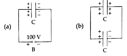53. A capacitor of capacitance C = 900pF is charged fully by 100V battery B as shown in figure (a). Then it is disconnected from the battery and connected to another uncharged capacitor of capacitance C = 900pF as shown in figure (b). The electrostatic energy stored by the system (b) is