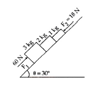 11. In the diagram shown, the normal reaction force between 2 kg and 1 kg is (Consider the surface, to be smooth) : Given g = 10ms