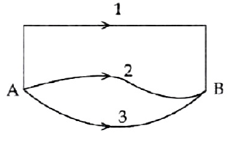 41. A gravitational field is present in a region and a mass is shifted from \(A\) to \(B\) through different paths as shown. If \(W_1\) \(W_2\) and \(W_3\) represent the work done by the gravitational force along the respective paths, then: