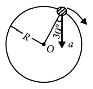 6. In the given figure, a = 15m\( s^{−2} \) represents the total acceleration of a particle moving in the clockwise direction in a circle of radius R = 2.5 m at a given instant of time. The speed of the particle is