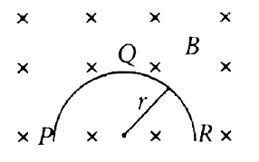 21. A thin semicircular conducting ring (PQR) of radius r is falling with its plane vertical in a horizontal magnetic field B, as shown in the figure.The potential difference developed across the ring when its speed is v, is