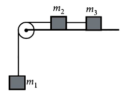 4. A system consists of three masses \(m_1\), \(m_2\) and \(m_3\) connected by a string passing over a pulley P. The mass \(m_1\) hangs freely and \(m_2\) and \(m_3\) are on a rough horizontal table (the coefficient of friction = \(\mu\)).The pulley is frictionless and of negligible mass. The downward acceleration of mass \(m_1\) is (Assume \(m_1\) = \(m_2\) = \(m_3 \) = m)